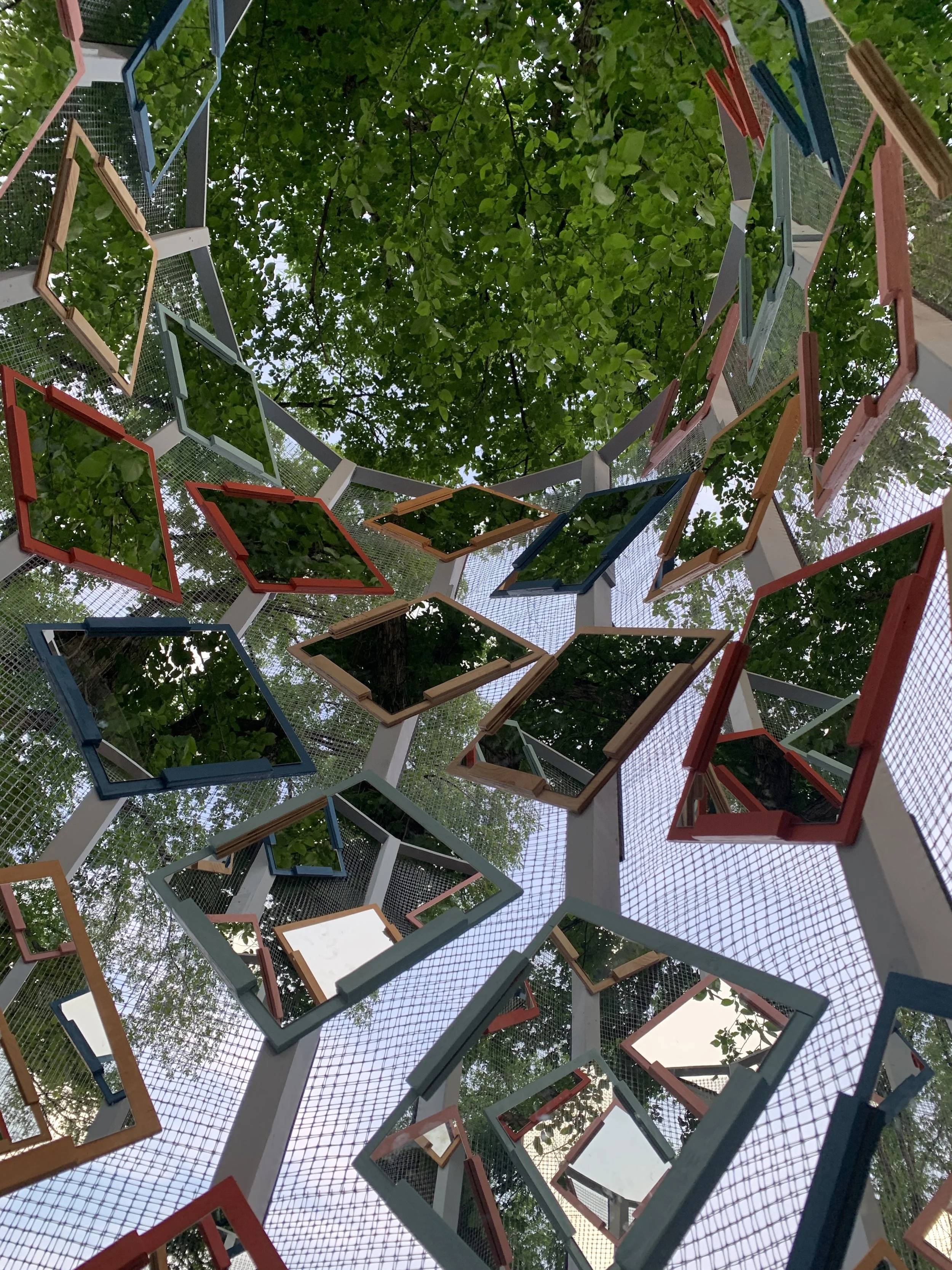 A secret hideout doubling as an inhabitable pseudo-kaleidoscopic infinity mirror, Sky Saw plays in the experiential differences between interior and exterior, earth and sky, magic and modernism. Are you in or out? Subject or object? Are the heavens above, below, or way out yonder?